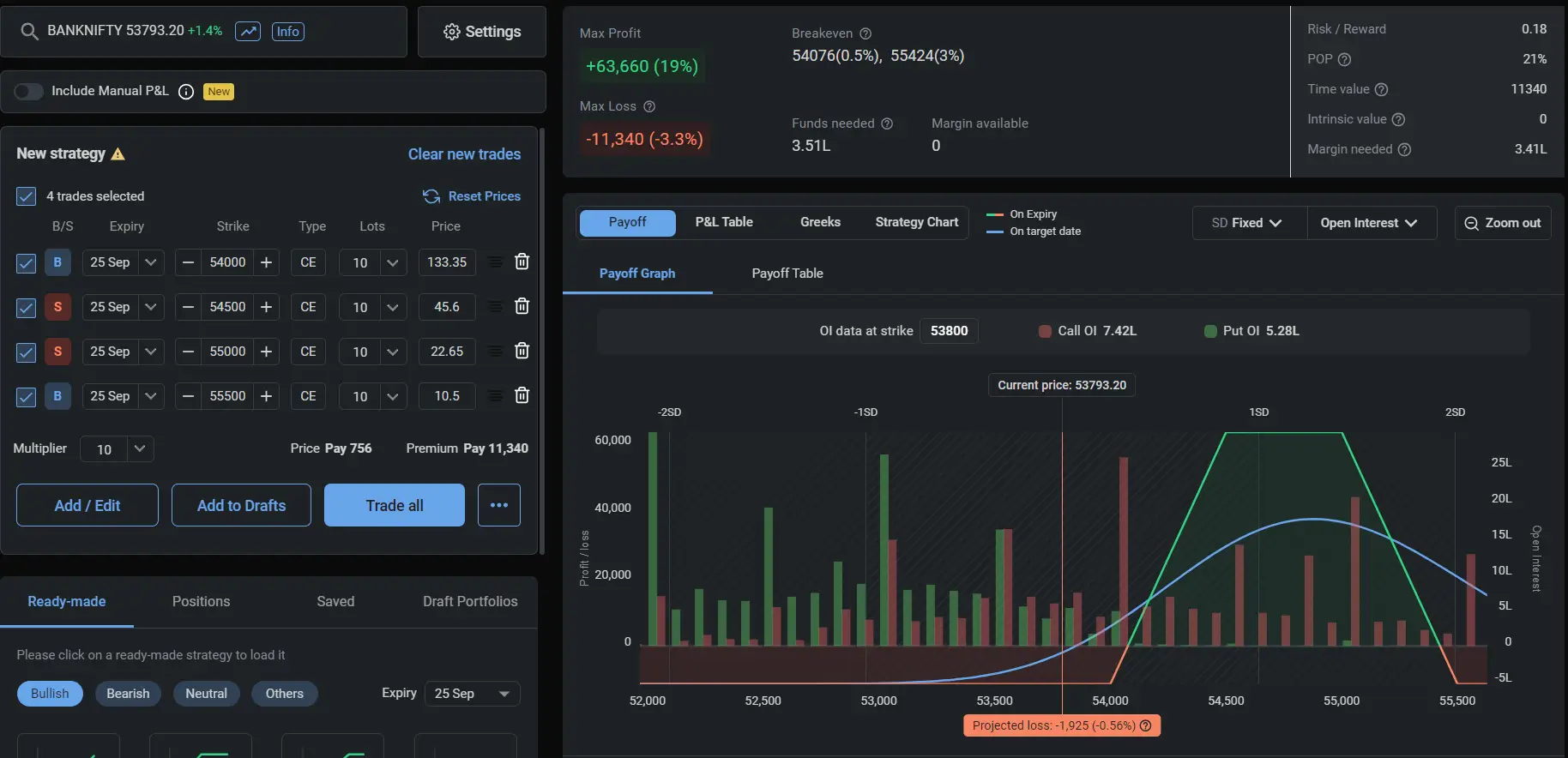- If on Monday, Bank Nifty manages to sustain above 53500 then, you could consider a bullish Iron Condor with the legs shown in the image below: