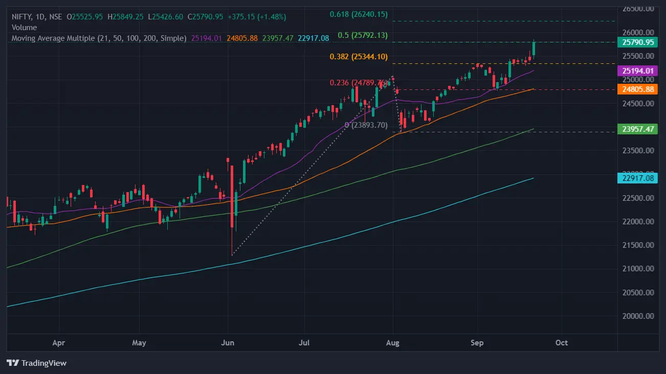 - Support & Resistance: Same as Bank Nifty, Nifty is also in a bullish trend and made a new all-time high last week. Now, Nifty has solid support at 25344 while facing resistance around 25792.