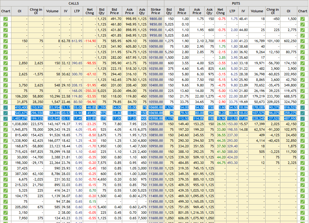 This is the Options chain around 12 PM. Now, look at the Open interest of 10700 and 10600. PCR at 10700 is 0.56 and PCR at 10600 is 4.55. According to thumb rules, PCR below 0.60 is strong resistance, and PCR above 1.80 is Strong support. Now if you look at the chart Nifty