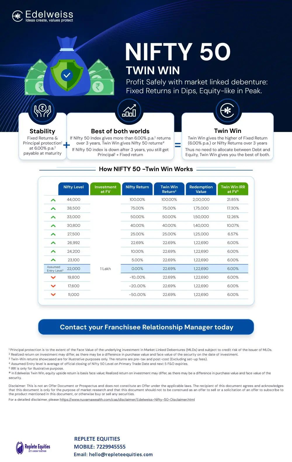The Nifty 50 Twin Win market-linked debenture offers fixed returns in flat/down markets and equity-like returns in rallies.